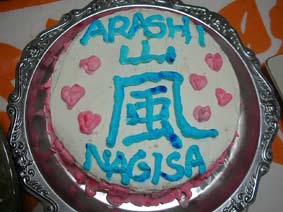 2009年 嵐 何でこんなケーキかというと 今年の凪沙は嵐(ジャニーズ)一色だから。 嵐という言葉を聞くだけで 顔がニンマリ。 でもこれ見て「風かと思った〜」 それはないでしょ(^^ゞ ピンクにブルーにハッピーな色合いです。 |