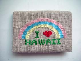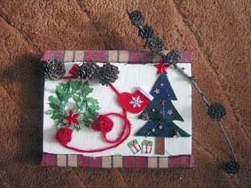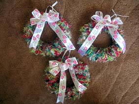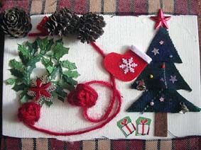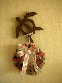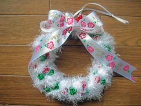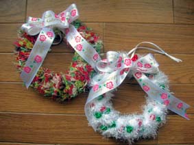 クリスマスカラーのヤーンとハワイアン柄のリボンを使って