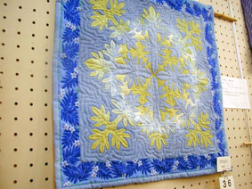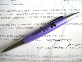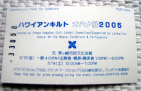 2005.5.14 前回のオハナ展から1年半。 延期もあって、待ちに待った茅ヶ崎です。 一昨年初めて、この作品展を見て 一般の方々の大作が沢山飾られてるのを見て こんな風に自分の作品が飾られたらどんな気分なんだろう… という気持ちでいっぱいでした。 あのときに、次回は出展してみたいという気持ちは変わらず、 今回のオハナ展に向け針を動かすことにしました。 途中、思いも寄らぬ失敗や、予定外のできごともあり 出展をためらったりもしましたが、 それも、いい記念になるかもしれないと、 最初の予定通り決行。 作品の郵送が完了した時はとてもホッとしました。 前回に引き続き今回も出展すると言うネットフレンドのひばなさんも 会場に行こうと思ってると言い嬉しいお話し。 一緒に出展して一緒に見に行かれるなんて こんな嬉しい事はありません。 思わぬオフ会です。 会場は前と同じ、茅ヶ崎市民会館。 なんだかドキドキです。 会場に入り、出展者のラベルをつけ見て回りました。 ハワイのキルターさんの作品にはやっぱり圧倒されるものが沢山。 生地や糸をすべてシルクで作っているものや、 アップリケとボーダの組み合わせをとても上手にしているもの。 キルトラインや、ボーダーの柄が凝りに凝っているものなど ワタシたちレベルではとても考えつかない技がいっぱいです。 そして、一般の作品の方へ行きました。 は、恥ずかしい (^_^;) あんなに、触り続け、見続けたキルトが、こんなところにあるなんて という感じです。 改めて良く見ると、反省点がこれまたほんとに多いのですが それと同じ位嬉しさもあったりしました。 ![]() 出展した時は、大変だったという気持ちが強く 最初で最後に違いないと思いましたが 終わって会場を後にすると ひばなさんと、また出してみたいって気持ちになるよねって 話していました。 またひとつ、やってみたいなと思っていた事を実現できて これからも楽しく頑張って行こうと言う意欲もわいてきました。 この作品展、E.ルートさんの作品のみだと思っていたら コニアさんの作品を出されている方がかなり多かったです。 そこで、今回の記念にコニアさんのパターン集を購入してみました。 ![]() かわいいパターンが多いです。 観賞用ですが(笑) ************************************************* 後日手元に帰ってきたキルトと共に 素敵なプレゼントが! ![]() 会場においてあったオハナ展のボールペン… なんだか嬉しい♪ |