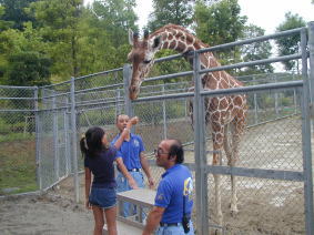 キリンにえさをあげたの。 葉っぱをもぐもぐ食べてたよ〜! |