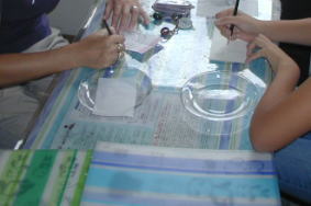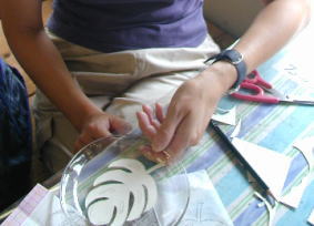 | ママとちいちゃんは サンドブラストっていうガラス工芸にチャレンジ。 ママはキルトの柄にするんだって。 やっぱりね〜 |