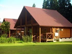 | ログハウスにも朝日が当たって綺麗。 また来たいな! 冬はスキー場が目の前にあるので 思い切りスキーやスノーボードが楽しめるんだって。 |