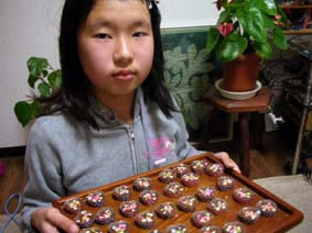2006.2.11 毎年同じようなバレンタインのチョコレート でも、同じでいいんだって。 チョコを溶かしてカップに入れて トッピングをするのが とっても楽しいらしい(笑) |