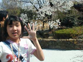 | 桜の前でパチリ♪ この下の白いの全部川に落ちた桜の花びらだよ! 真っ白です。 |