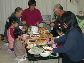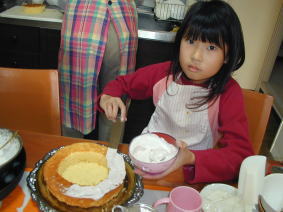 今日は、じーちゃん、ばーちゃん かえでくん、しおりちゃんたちとクリスマスパーティ。 なぎさも、おおいそがしでケーキを作ってるの。 |