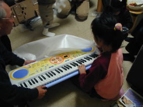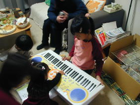 おまちかね プレゼントの時間!! じーちゃんとばーちゃんからは キーボードをもらいました どうしよう うれしくてドキドキ! |
