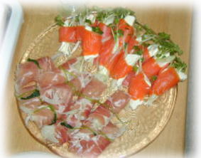 上は、クリームチーズをサーモンでまいてあったよ 下は玉ねぎのマリネを生ハムでまいてあります。 |