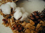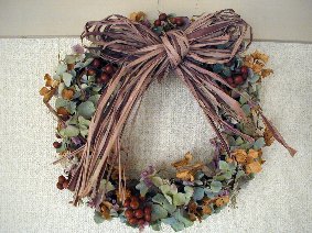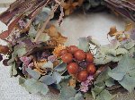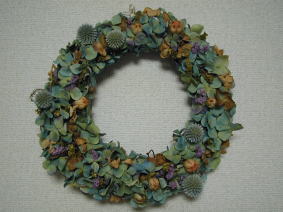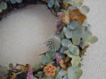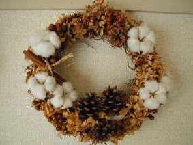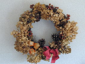 ドライあじさいをベースに マツボックリや、わたの実 サンキライを使って 冬っぽいリース |