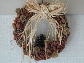 | 公園で拾ったたくさんのどんぐりで。 トップにラフィアをふわっと結んでみました |