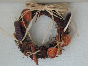 | haruフラワースタジオさんの材料プラス 持っていた材料で… 写真では少し見にくいのですが 色とりどりのドライを付け、 最後にラフィアを結びアクセントとしました |