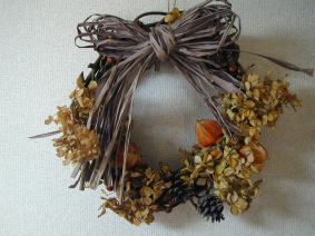 | 紫陽花をベースにまつぼっくり、 ほおずきでアクセントをつけました |